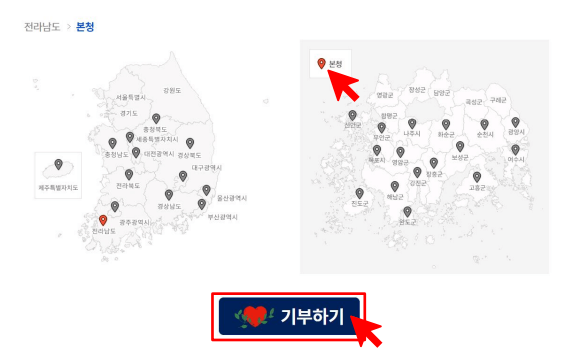 먼저, 시/도를 선택한 다음 군/구에 속하는지 선택해주세요. 그런 다음 기부하기 버튼을 클릭하면 기부 페이지로 이동합니다. 로그인되어 있지 않으면 로그인 페이지로 이동합니다. 페이지 하단에서는 선택한 지자체에 대한 정보, 답례품, 공지사항 등을 확인할 수 있습니다. 관심 지자체로 등록하면 마이페이지 > 관심 지자체 목록에 등록됩니다.